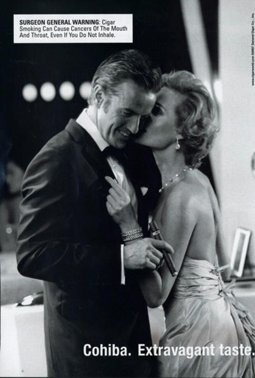 Advertisement for Cohiba cigars, featuring an image of a formally dressed couple, with the woman seen whispering into the man's ear, and the man shown holding a lit cigar.