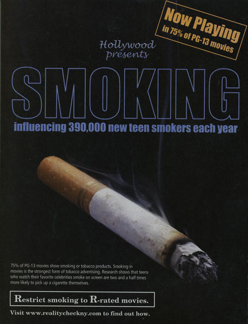 Advertisement from the anti-tobacco group Reality Check NY raising awareness about the issue of smoking in movies. Text: "Smoking - influencing 390,000 new teen smokers each year" "75% of PG-13 movies show smoking or tobacco products. Smoking in movies is the strongest form of tobacco advertising. Research shows that teens who watch their favorite celebrities smoke on screen are two and a half times more likely to pick up a cigarette themselves."