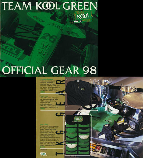 1998 Team Kool Green Official Gear Catalog, featuring items such as clothing with Team Kool logos available for purchase (using dollars, not pack UPC codes). Order form included.