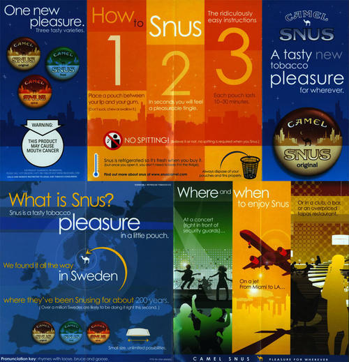 A small 4 panel brochure for Camel Snus found at the point-of-sale in Austin, Texas, one of the two test market locations for this product introduced in 2006. Brochure describes what snus is and how, where and when to use it. Snus is a low nitrosamine moist oral snuff product (packaged in small pouches that eliminate the need for "spitting")which has been popular in Sweden for years.