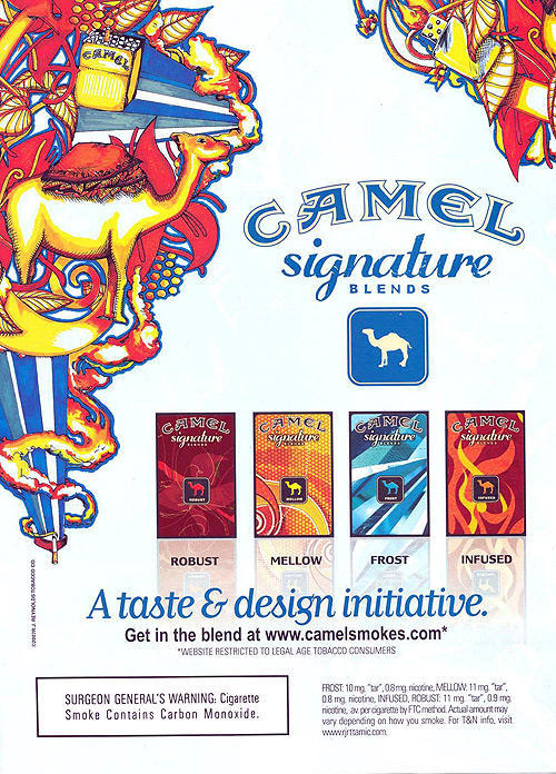 Ad for Camel Signature Blends, 4 different blends introduced in the spring of 2007. Text: "A taste & design initiative." The ad includes an image of each of the four styles: Infused, Mellow, Robust and Frost.
