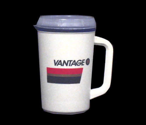 White Plastic Mug, with lid. Vantage logo on each side of mug. Coupon for "Save $1.00 on 2 packs" included inside.