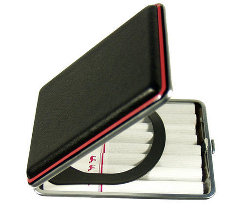 Cigarette case sent as a gift by direct mail from Camel in promotion of the female targeted Camel No. 9 cigarettes. This cigarette case uses the black and fuchsia colors of the Camel No.9 pack, and includes a mirror on the inside cover. An offer for this free case was presented in earlier Camel No. 9 promotional direct mail, as well as on the brand's website.