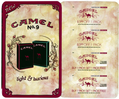 Direct mail in promotion of Camel No. 9 cigarettes, featuring images of the stylish packages targeted at female audiences as found in magazine advertisements. "New Camel No. 9" "light & luscious". This direct mail piece also included 4 coupons (2 "Buy 1 Get 1 Free" coupons, and 2 coupons for $3.00 off of a pack). Camel No. 9 products were introduced for sale in February 2007.