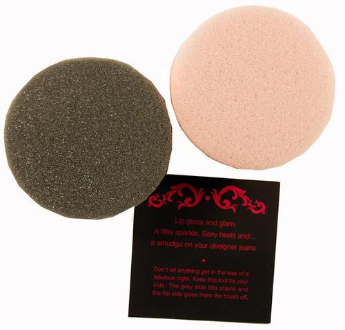 Stain remover puffs provided as one of many free gifts at a Camel No. 9 promotional bar party/event in Portland, Oregon. A black and pink note, following the Camel No. 9 theme colors, provides a description of the gift product: "Lipgloss and glam. A little sparkle. Sexy heels and...a smudge on your designer jeans. Don't let anything get in the way of a fabulous night. Keep this tool by your side. The gray side lifts stains and the flip side gives them the brush off."