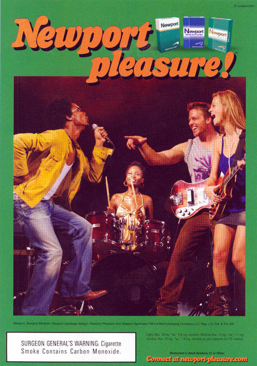 Ad for Newport cigarettes featuring an image of two men and two women laughing, playing music and having fun on a stage.