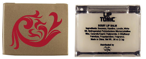 Top and bottom side views of a berry lip balm product, distributed as one of many free gifts at a Camel No. 9 promotional bar party/event in Portland, Oregon. The top of the case features pink design marks, in following with the pink themed coloring of Camel No. 9 cigarettes.