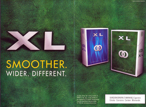 2 page ad from Kool in promotion of Kool's XL wide packs, XL Green and XL Blue. XL Blue was introducted in the summer of 2007, after the introduction of XL Green. Text: "XL. Smoother. Wider. Different."