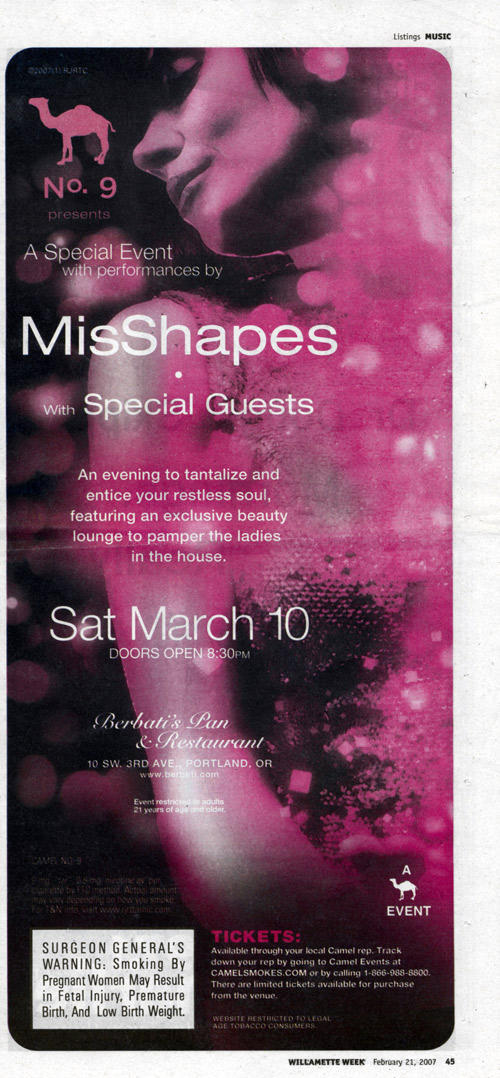 Newspaper advertising for a Camel No. 9 bar/party event in Portland, Oregon, featuring the musical group, The MisShapes. The ad uses pink and black coloring, following the coloring theme of Camel No. 9 cigarettes, and promotes the event as: "An evening to tantalize and entice your restless soul, featuring an exclusive beauty lounge to pamper the ladies in the house."