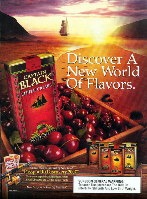 Ad for sweet cherry flavored Captain Black Little Cigars. Features an image of the pack in a box of cherries, lying on a beach. "Discover a New World of Flavors."
