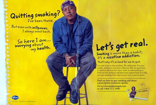 2 page cessation ad from Pfizer, featuring an image of an African American man sitting down and holding a cigarette, against a bright yellow background. Text: "Quitting smoking? I've been there. But even with willpower, I always went back. So here I am...worrying about my health."