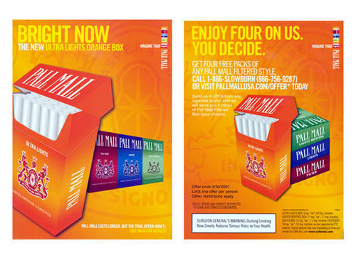 Ad for the introduction of Pall Mall Ultra Lights in a brightly colored orange package. Ad features an image of the pack, along with Pall Mall's other blends, against an orange colored background. Backside of the ad provides an offer for 4 free packs. "Enjoy four on us. You decide." "Get four free packs of any Pall Mall filtered style. Call 1-866-SLOWBURN (866-756-9287) or visit pallmallus.com/offer today."