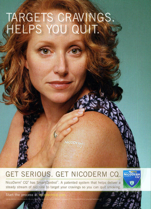 Ad for Nicoderm nicotine patches, featuring an image of a woman wearing a clear patch/sticker on her arm. Text: "Targets Cravings. Helps You Quit."