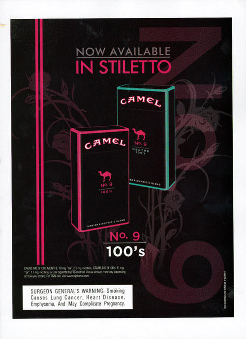 Ad for Camel No. 9 100's "Stiletto" cigarettes,targeted at female audiences, featuring images of the slimmer and longer Camel No. 9 stylish cigarette packs against a black background. Camel No. 9 products were introduced for sale in February 2007. Ads for the "Stiletto" style began circulating in August/September 2007.