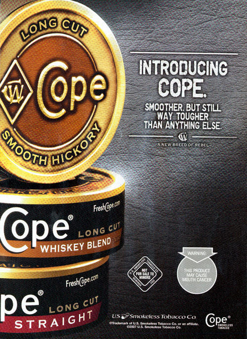 Ad introducing new blends of Copenhagen moist smokeless tobacco, including Smooth Hickory and Whiskey Blend. An image of the cans for the blends as well as of the Long Cut Straight blend is featured. Text: "Introducing Cope. Smoother. But still way tougher than anything else."
