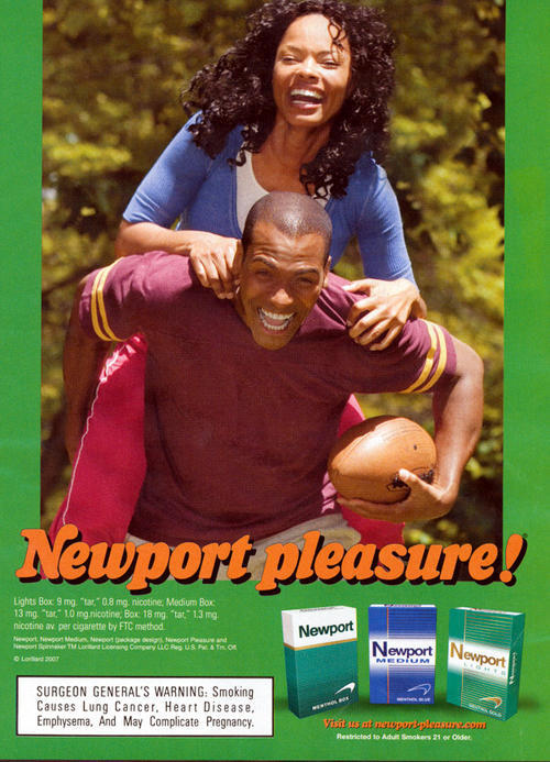 Newport ad featuring an image of an African American couple laughing and having fun playing football.