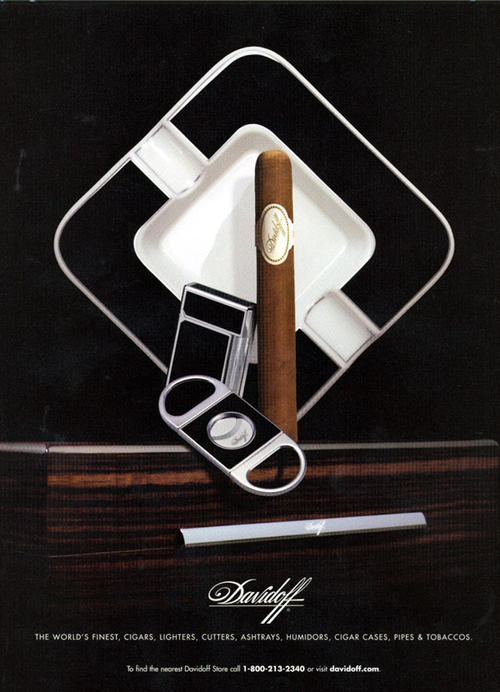 Ad featuring image of a Davidoff cigar, ashtray, lighter and cigar cutter.
