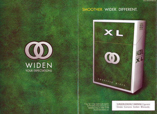 Two page ad in promotion of Kool's green XL blend. Features an image of the green widepack against a green marbled background. "Widen your expectations"