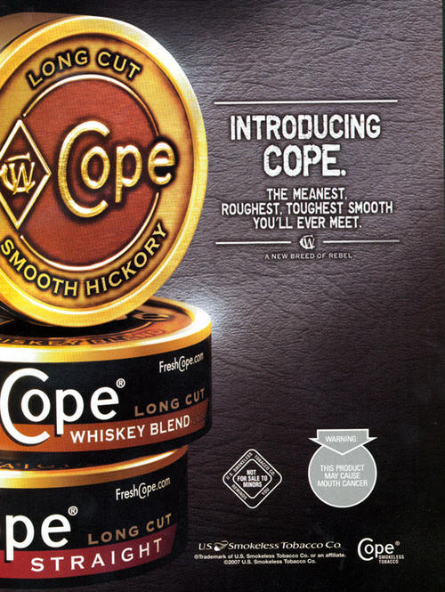 Ad introducing new blends of Copenhagen moist smokeless tobacco, including Smooth Hickory and Whiskey Blend. An image of the cans for the blends as well as of the Long Cut Straight blend is featured. Text: "Introducing Cope. The meanest, roughest, toughest smooth you'll ever meet."