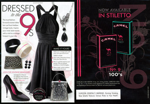 2 page ad in promotion of Camel No. 9 100's "Stiletto" cigarettes,targeted at female audiences, featuring images of the slimmer and longer Camel No. 9 stylish cigarette packs against a black background. Camel No. 9 products were introduced for sale in February 2007. Ads for the "Stiletto" style began circulating in August/September 2007. This ad (left page) also promotes the vintage fashion related feature found on Camel's website, where users can learn about different vintage shops in various cities.