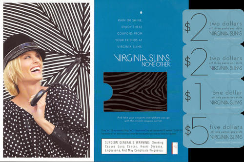 General promotional direct mail from Virginia Slims, featuring an image of a woman with a black and white outfit and umbrella. Four cigarette coupons included. Cover text: "Rainyday Savings"