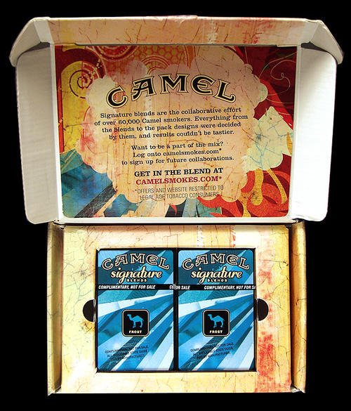 These packs were sent based on an offer from a previous direct mail piece, which asked receivers to mail in 2 UPCs from any cigarette brands in exchange for two free packs of any style of Camel Signature cigarettes.