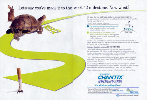 Two page ad in promotion of Chantix tablets, presciption drugs for aid in smoking cessation. Ad's imagery refers to the story of the "tortoise and the hare", and the lesson that being "slow and steady wins the race". In this ad, the tortoise can be seen reaching the 12 week marker.