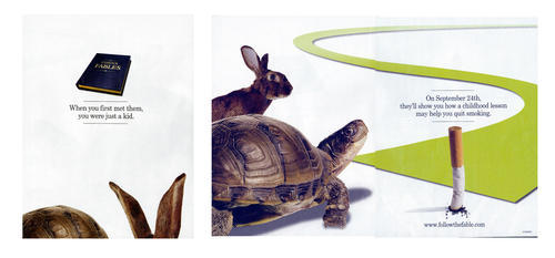 Three sided ad in promotion of Chantix tablets, presciption drugs for aid in smoking cessation. Ad's imagery refers to the story of the "tortoise and the hare", and the lesson that being "slow and steady wins the race". Text: "When you first met them, you were just a kid. On September 24th, they'll show you how a childhood lesson may help you quit smoking." This ad did not actually advertise Chantix specifically, but rather directed readers to a website (www.followthefable.com)which did not include the name Chantix in it's web address. Ad found in Entertainment Weekly: September 21, 2007.