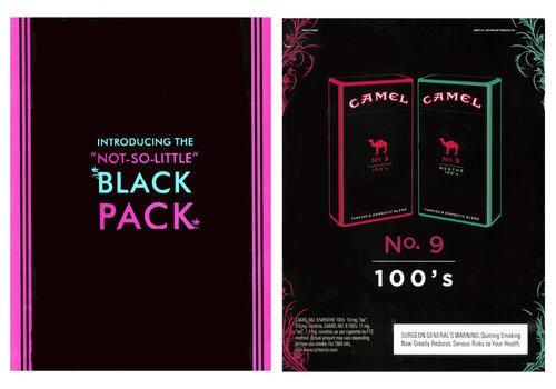 Two sided Camel ad in promotion of Camel No. 9 100's Stiletto cigarettes, a Camel product introduced in 2007 for female audiences. Ad features an image of the packs against a black background on the backside of the ad, and an introductory note on the frontside of the ad, also against a black background: "Introducing the 'NOT-SO-LITTLE' BLACK PACK". This line alludes to the idea of the "little black dress," commonly referred to as an essential clothing item for all women. Ad found in female magazines and consists of a heavier paper stock.