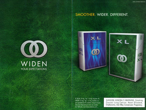Two page ad in promotion of Kool's two XL blend versions. Features an image of the green and the newer blue widepacks against a green background. Text: "Widen Your Expectations" "Smoother. Wider. Different."
