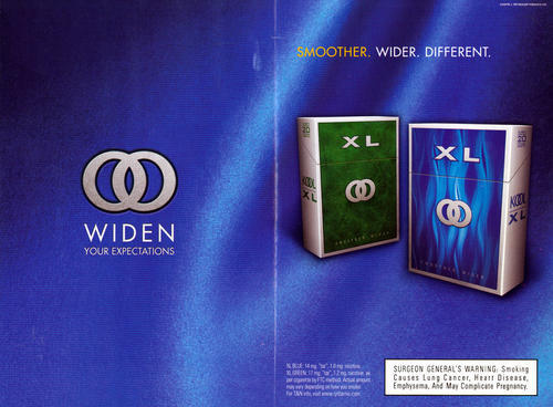 Two page ad in promotion of Kool's two XL blend versions. Features an image of the green and the newer blue widepacks against a blue background. Text: "Widen Your Expectations" "Smoother. Wider. Different."