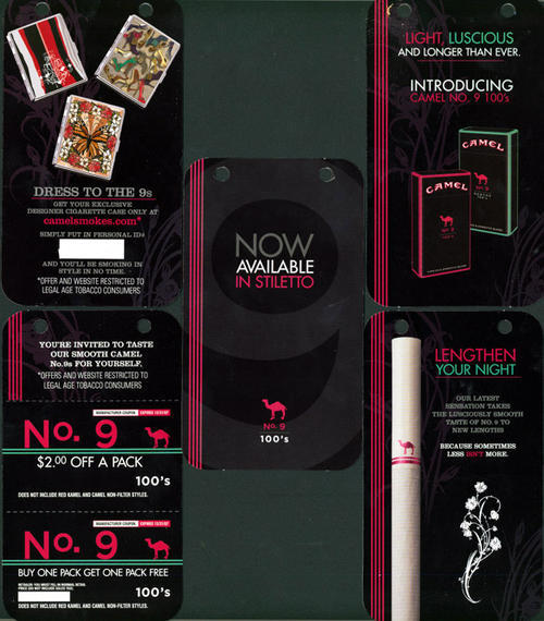 Various pages of a direct mail piece from Camel in promotion of the longer length 100s No. 9s, called "Stiletto". Piece comes with two coupons ($2.00 off a pack and a Buy 1 get 1 free coupon) and with an offer for a free designer cigarette case, which can be redeemed by going to the brand's website.