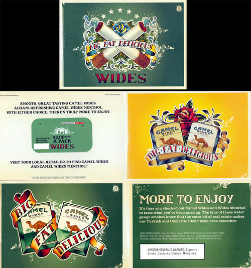 Direct mail in promotion of Camel Wides. Features tattoo styled art seen in print ads for Camel Wides. Piece includes 3 coupons (2 $2.00 off a pack coupons and 1 Buy 1 Get 1 Free coupon).