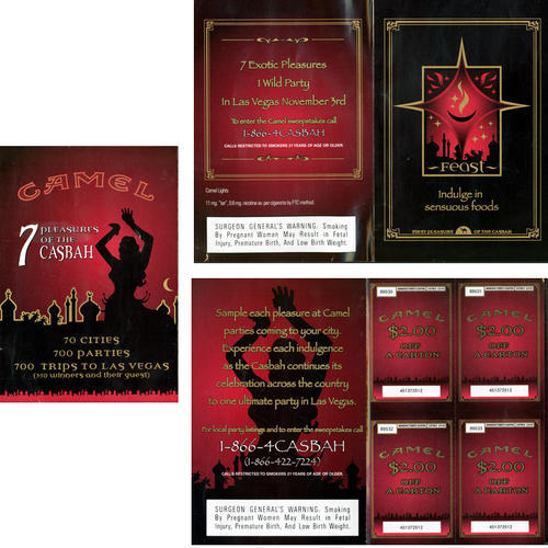 Direct mail piece from Camel in promotion of the 7 Pleasures of the Casbah campaign. Advertises sweepstakes for trip to Las Vegas and directs receivers to phone number for party listings. Comes with 4 coupons.