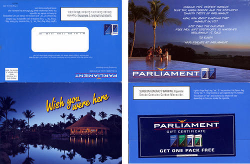 "Imagine this perfect moment. Blue sky, warm breeze and the distinctly smooth taste of Parliament. Now, how about enjoying that moment on us? Just take the enclosed free pack gift certificate to wherever Parliament in sold. So enjoy! Your friends at Parliament."