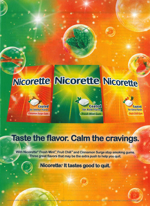 Ad for flavored varieties of Nicorette stop smoking gum: Cinnamon Surge, Fresh Mint, and Fruit Chill. "Taste the flavor. Calm the cravings. Nicorette. It tastes good to quit."