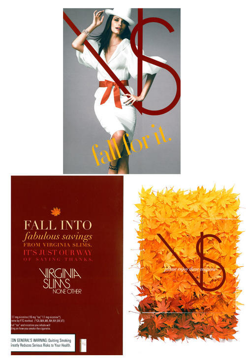 Fall themed direct mail from Virginia Slims with 4 coupons included. Text: "Fall for it"