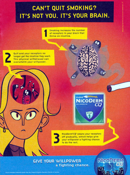 Ad in promotion of Nicoderm, a nicotine replacement therapy product/ stop smoking aid. Ad features cartoon imagery of a woman and the receptors in her brain. "Can't quit smoking? It's not you. It's your brain."