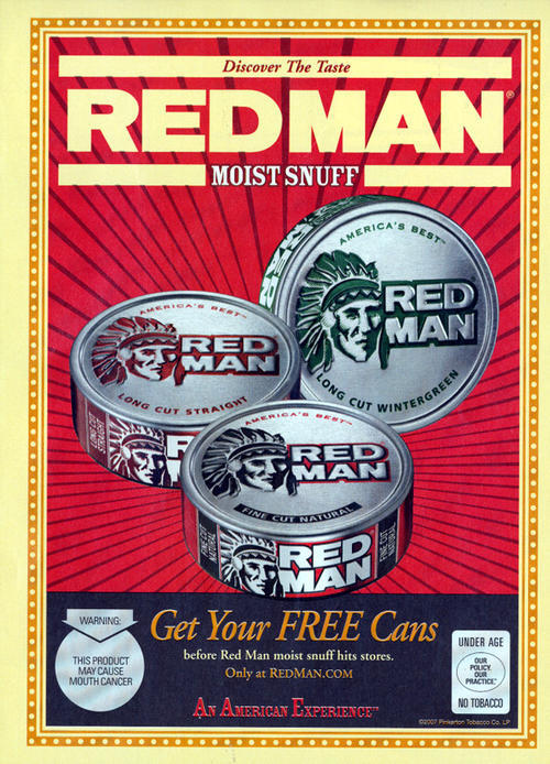 Ad in promotion of Red man moist snuff tobacco, featuring an image of three varieties of the product(natural, straight, wintergreen), and an offer to get free cans of the products before it "hits stores" by visiting the brand's website. "Discover the Taste."