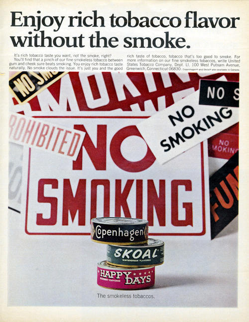 Ad from USST (United States Smokeless Tobacco) in promotion of Copenhagen, Skoal and Happy Days brands of moist smokeless tobacco/snuff. Ad features an image of three cans of the product stacked in front of a medley of "no smoking" signs. Headline - "Enjoy rich tobacco flavor without the smoke."