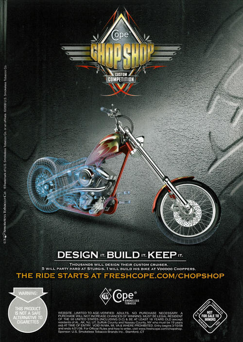Ad from Copenhagen in promotion of the "Chop Shop" an online feature and competition, which allows users to design their "ideal" motorcycle/bike, and to submit their design into a contest for a chance to actually have a bike custom made. Finalists can win a trip to a bike rally in Sturgis, South Dakota. "Design it. Build it. Keep it." Ad found in: Maxim, April 2008