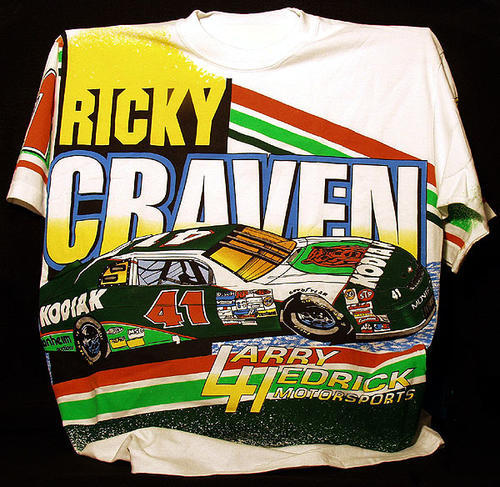 White medium 100% cotton T-shirt with "Ricky Craven" and a race car on front in multicolors - on the back "41" in orange and a picture of a racecar.
