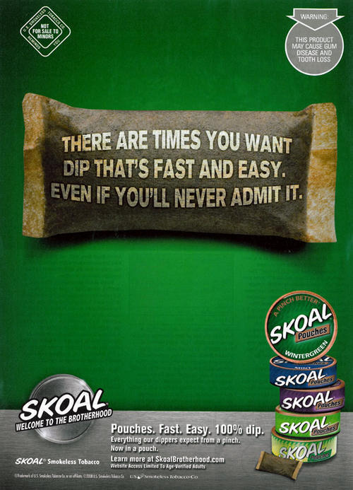 Ad for Skoal Pouches featuring a large image of a single pouch. Text: "There are times you want dip that's fast and easy. Even if you'll never admit it."