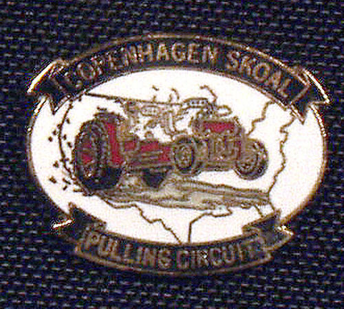Small pin, white, "Copenhagen Skoal Pulling circuit" written in black and gold. Picture of red car with black tires in the middle.