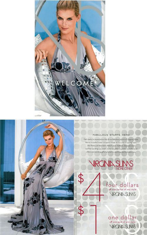 Direct mail from Virginia Slims welcoming the receiver to the mailing list and providing 2 coupons. "Fabulous Starts Here". "Get ready to experience the oh-so-fabulous world of Virginia Slims. We've included some coupons inside as our way of saying hello. But that's just the start. Watch your mailbox, because soon we'll be sending you even more valuable coupons, one-of-a-kind offers and exciting gifts tailored to anything-but-ordinary you."