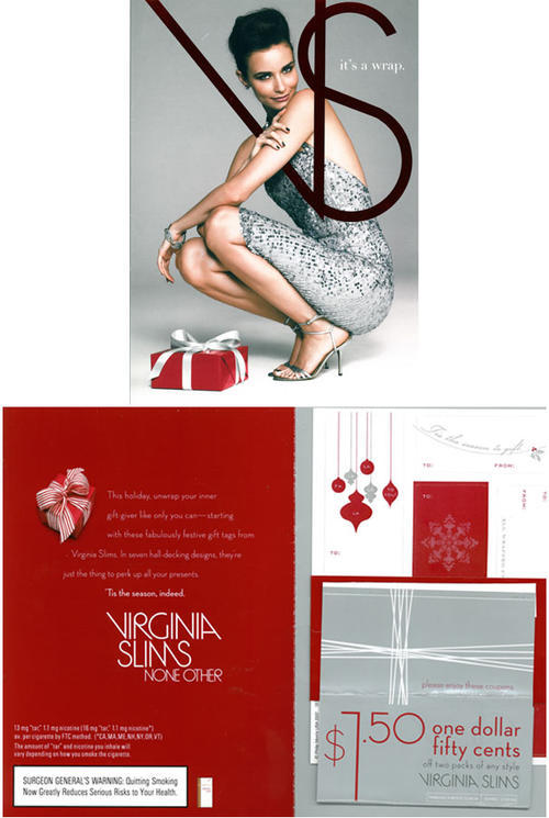 Christmas/winter holiday themed direct mail from Virginia Slims received December 2007. Gift tag labels and four cigarette coupons included. Text: "This holiday, unwrap your inner gift-giver like only you can - starting with these fabulously festive gift tags from Virginia Slims. In seven hall-decking designs, they're just the thing to perk up all your presents. 'Tis the season indeed."