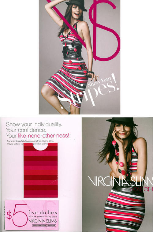 Text: "Show your stripes!" "Show your individuality. Your confidence. Your like-none-other-ness! And enjoy these fabulous coupons from Virginia Slims. They're just our way of showing you our appreciation."