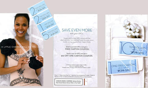 Direct mail from Virginia Slims offering receivers to send in 200 UPCs to get a free carton coupon or 70 UPCs to get a $10 off one carton coupon. Piece also included 4 free coupons
