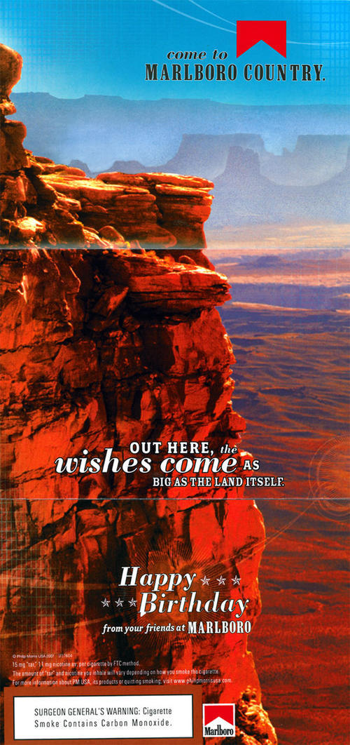Birthday card from Marlboro sent by direct mail. Coupon included for $2.50 off any style of Marlboro cigarettes.