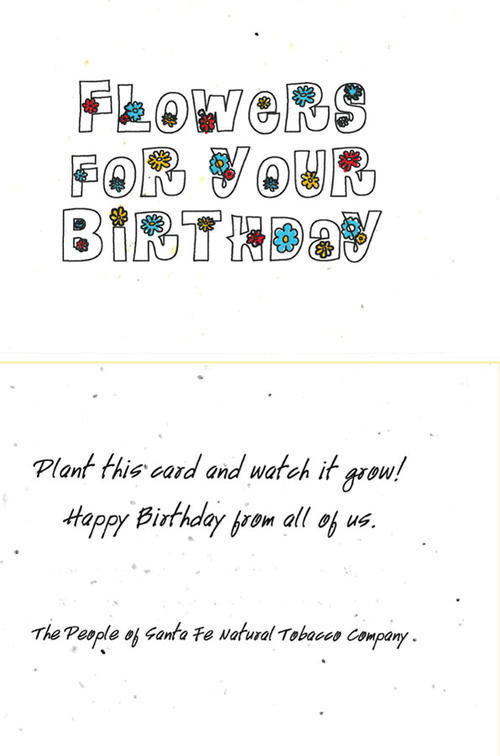 Birthday card from Natural American Spirit sent by direct mail. Card is made from recycled paper and embedded with annual and perennial wildflowers. "Plant this card and watch it grow! Happy birthday from all of us!"